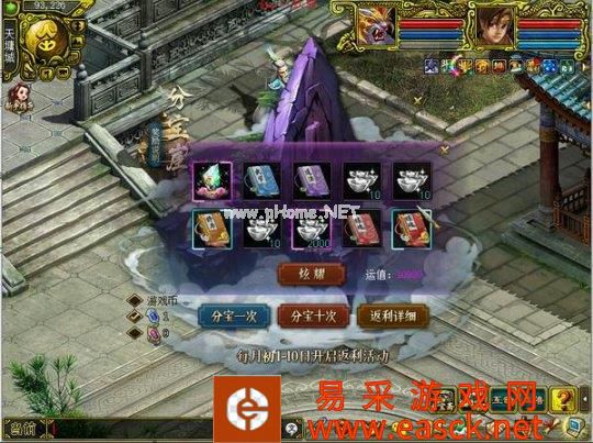 一、经典版的【分宝崖】活动进行中,相性首饰、轮转玉、高阶坐骑、限定神兽、变异、稀有属性天书等好礼待道友来抽!活动截止至9月10日23:59,在游戏内主界面右上角点击“分宝崖”活动小图标,打开活动面板。活动参与方式有两种:“分宝1次”和“分宝10次”,活动期间,点击“返利详细”可查看累积分宝次数,以及对应的阶段奖励及排行奖励。