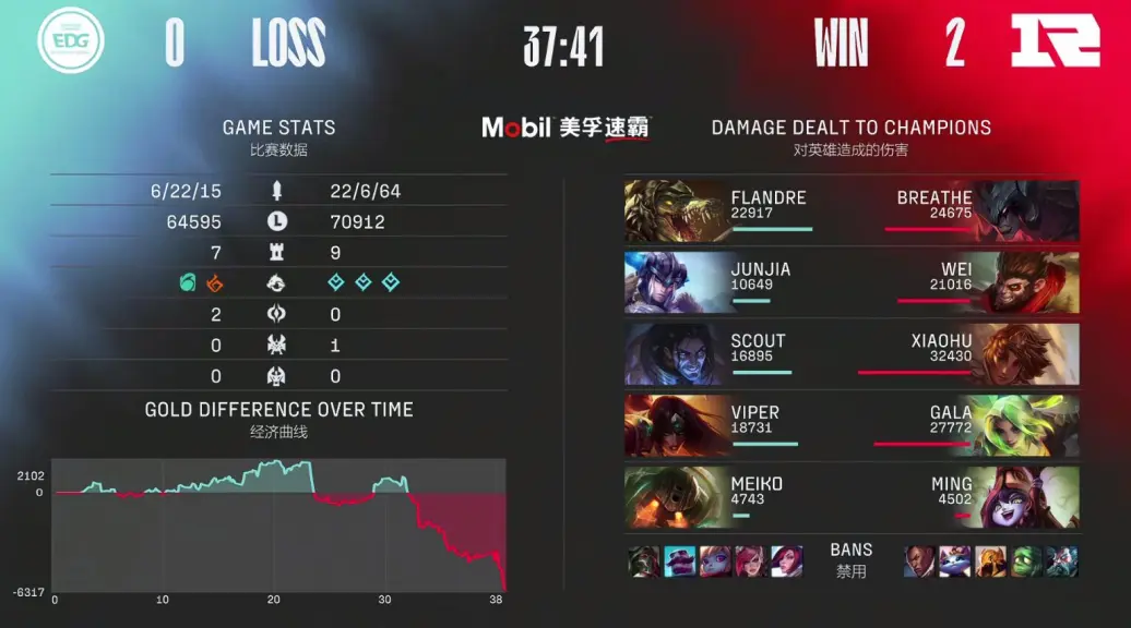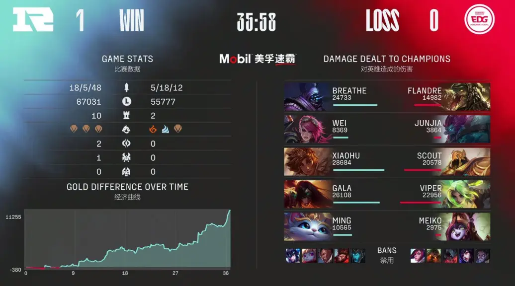 在不久之前的《英雄联盟》LPL赛区全球总决赛冒泡赛中,EDG完成对RNG的让二追三,以LPL三号种子身份,晋级《英雄联盟》S12全球总决赛。 第一局 RNG 1:0 EDG 开局3分钟,双方上野在野区发生摩擦,RNG Wei蔚在Breathe武器的帮助下丝血反杀EDG Flandre鳄鱼,率先拿到一血。前期9分钟峡谷先锋团,RNG利用人数优势集火击杀赶来探路的EDG上野,拿下峡谷先锋。中期RNG Breathe武器通过41分带来回拉扯EDG众人,助RNG成功扩大优势。30分钟,RNG以损失两人为代价强势拿下大龙。后期35分钟小龙团,RNG Wei蔚大招先手开团,Breathe武器TP赶到战场打出成吨输出,RNG 1换5轻松团灭EDG,一波终结比赛,先下一城!