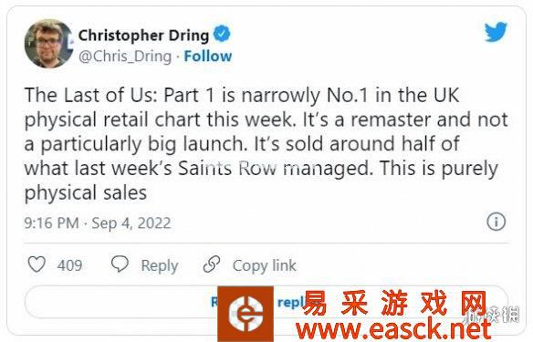Dring指出:这是一款复刻版游戏,所以不是什么特别重大的游戏发售。它的销量大约只有上周《黑道圣徒:重启版》的一半,需要注意的是,这只是统计了实体版的游戏销量,并未计算数字版游戏的销量,考虑到PS商店庞大的数字版游戏销量,我们可以期待一下《最后生还者:重制版》数字版的游戏也会有一个不错的销量成绩。