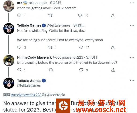 开发商Telltale Games正在筹备很多新作,包括《与狼同行2》和《苍穹浩瀚》。《苍穹浩瀚》已经确定将在2023年夏季发售,《与狼同行2》官方则只宣布了将于2023年发售。 一位推特用户就发售日期的事情询问了官方:《与狼同行2》会在《苍穹浩瀚》之前发售还是之后发售?Telltale Games回答表示:目前还没有答案。但两者当前都定在2023年发售。我们现在只能说这些。 此外,《与狼同行2》目前的开发进展也不得而知。在另一条推文中,Telltale Games表示《与狼同行2》暂时也不会有任何内容更新:“让开发者自己开发。我们非常小心,不要过度炒作。” 《与狼同行2》将登陆Xbox Series X|S、Xbox One、PS5、PS4、Epic。 |
