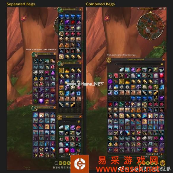 伴随着这些改动,玩家们会立刻注意到更多显而易见的变化。例如小地图和生命条变得更加显眼,我们也移除了一些杂乱的元素,提供更多的浏览空间。而且在保留标志性设计的同时,我们也调整了动作条的外观。我们在动作条上添加了一组全新的狮鹫图案,而对于部落英雄们,我们同样创造了新的双足飞龙图样。战利品和物品栏的展示也有了新外观,玩家们可以使用组合背包功能来帮助他们更快地找到物品栏中的物品,方便整理。