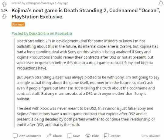 据泄密者DuskGolem的说法,《死亡搁浅2》正在索尼的协助下积极开发。制作《死亡搁浅》新游戏的说法并不新鲜,但DuskGolem还声称这将是PlayStation的独占游戏,其内部代号为“Ocean”(海洋),这可能意味着游戏将来到大海之上(代号也可以并无实际意义)。DuskGolem还特意表示,小岛工作室与Xbox的协议与《死亡搁浅2》无关,该工作室尚未决定是否在游戏发行后继续与索尼的保持独占协议。