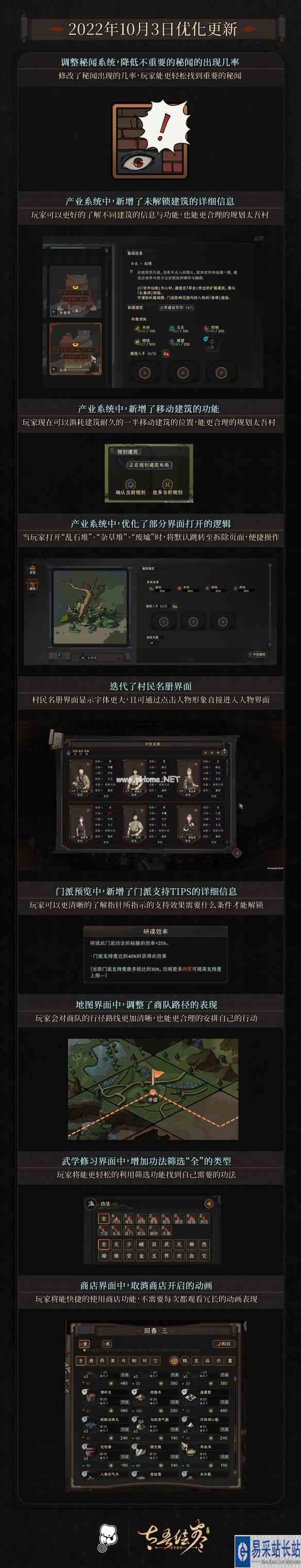 好消息是,今天制作组也发布了一次更新,降低了不重要的秘闻的出现几率,这样玩家能更轻松找到重要的秘闻;新增了未解锁建筑的详细介绍信息、以及移动建筑的功能,方便玩家提前对太吾村建设做好规划;调大了村民名册界面文字大小,并且能点击人物形象进入详情界面;在门派预览页面还添加了小提示让玩家有更清晰的了解。