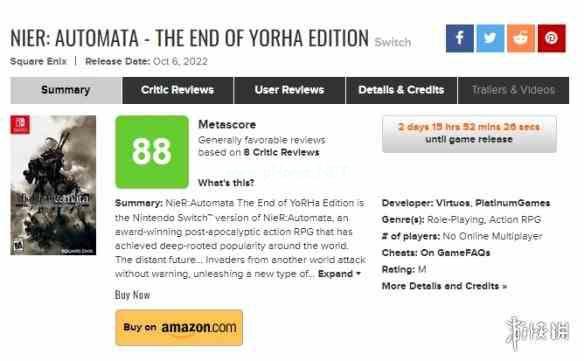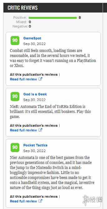 《尼尔:机械纪元》Switch将于10月6日正式发售,目前该作的媒体评分已经解禁,M站目前已经有8家媒体给出了他们的评价,无一例外都是高分。 外媒对该作在Switch的移植版评价颇高,并且表示对于还没有游玩过、拥有Switch的玩家来说是个非常不错的选择。