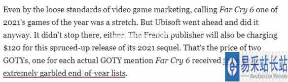 kotaku表示,即使放宽游戏的营销标准,将《孤岛惊魂6》评为2021年度游戏也有些牵强。但育碧还是一意孤行做了这件事,将整合了4个DLC的“完整版”命名为“年度版”。