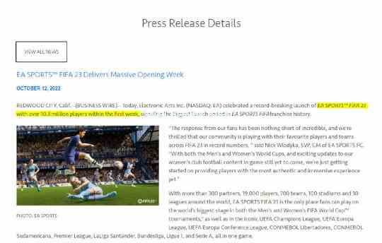 没有什么数据,比销量和玩家数更能说明一款游戏的成功与否了。发布于九月底的《FIFA23》,在上线一周后就为EA创造了新的纪录——“系列最佳的首发成绩,首周玩家数超过了1030万人!”