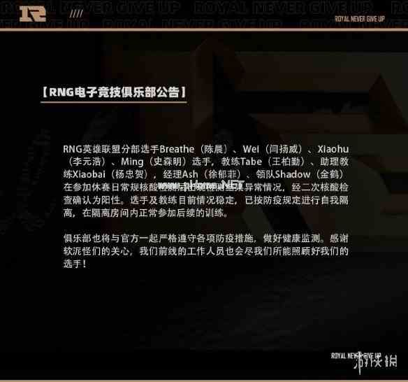2,《英雄联盟》RNG战队除ADC选手外全部感染新冠 《英雄联盟》RNG电子竞技俱乐部今日发布公告表示,在S12休赛日常规核酸检测中发现,除了ADC选手GALA外,参加S12的RNG战队成员全部感染新冠,目前选手及教练已按防疫规定进行自我隔离,在隔离房间内正常参加后续的训练。查看原文>>