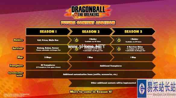 近日,万代南梦宫公布了《七龙珠:破界斗士》未来赛季的路线图,游戏的设计考虑到了多人游戏的生命周期,因此未来已经有几个赛季的内容在计划中。发行商透露了这个未来内容的粗略路线图,包括这些赛季的预期内容。 根据路线图,《七龙珠:破界斗士》第2赛季将包含一个新的“侵略者”角色,可以使用一个TP代币兑换获得。此外,三款新的“幸存者”皮肤也将加入游戏,其中两种皮肤可以使用TP代币兑换。第2赛季还将添加一张全新地图。第3赛季也将拥有相似内容。 目前游戏已经登陆了PC、PS4、Switch 和 Xbox One。游戏在 Steam 国区售价98元,目前评价褒贬不一(主要为服务器联机问题),支持简体中文。 |
