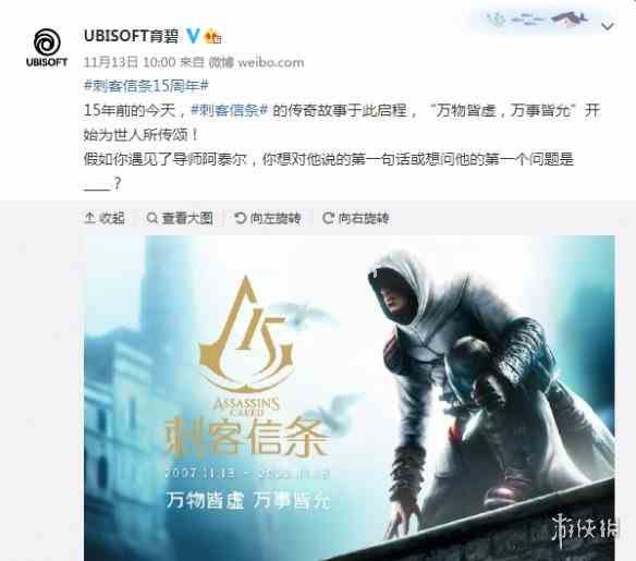 2007年发售的《刺客信条》迎来15岁生日,育碧发文庆祝这段传奇故事的开始。该系列目前为育碧的当家IP,除了育碧中国外,其他国家工作室的官号也都有发文庆祝。