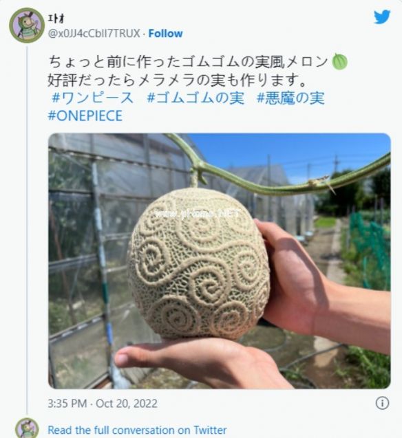 吃了《海贼王》的恶魔果实会获得特殊能力,恶魔果实最大的特点就是在于神奇的果实外貌,与让人不敢恭维的可怕味道。近日推特上出现了一颗花纹神似恶魔果实的香瓜。