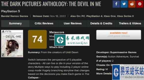 今天,《黑相集:心中魔》的M站评分已解禁,截至发稿,有15家媒体给出了评价,均分为74分,其中10家媒体给出了好评,5家媒体给出了中评。本作今天已正式发售。 COGconnected给出了84分的好评:《黑相集:心中魔》这款游戏在某种程度上超越了该系列之前的作品。游戏的配音也做的相当出色,加强了玩家的代入感。 Hobby Consolas给出了80分的好评:《黑相集:心中魔》这部作品,对于任何想要享受恐惧和杀戮的人来说都是一款值得推荐的游戏。 GameByte给出了60分的中评:恐怖游戏的核心在于恐怖元素,《黑相集:心中魔》的开发商Supermassive Games在维持某些场景中的那种恐怖氛围做得很好,但却无法在整个游戏中一直维持这种恐怖氛围。 |