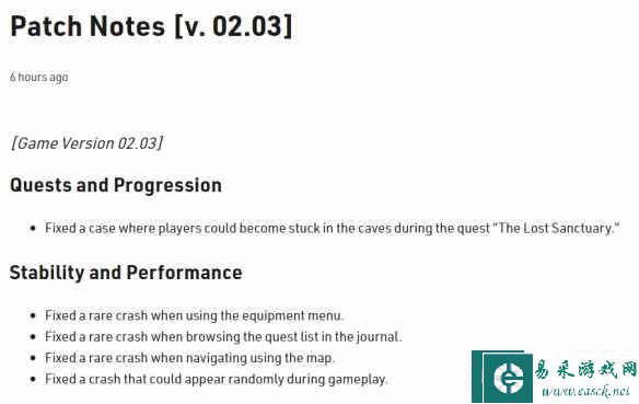 ·任务和进度 修复了玩家在任务“失落的庇护所”期间可能被困在洞穴中的情况 ·稳定性和性能 修复了使用设备菜单时出现崩溃的问题 修复了在日记中浏览任务列表时出现崩溃的问题 修复了使用地图导航时出现崩溃的问题 修复了在游戏过程中可能随机出现崩溃的问题
