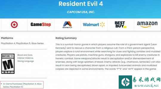近日《生化危机4:重制版》通过了ESRB评级,显示为M成人级(R17)。从评级页面可以看到,本作将包含游戏内购,特别是针对PS4、PS5和XSX|S主机版。