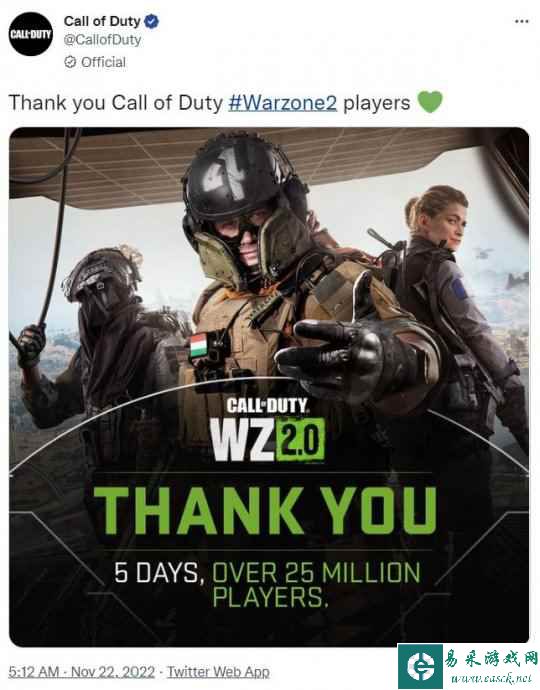 《使命召唤:战区2》于11月17日正式发售,登陆PS5、PS4、Xbox Series X|S、Xbox One和PC,其官方推特今日宣布,在短短5天时间里,《使命召唤:战区2》的玩家人数已突破2500万。 目前,《使命召唤:战区2》在Steam上的玩家评测为“多半差评”,9353篇评测中只有34%为好评。