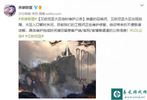 官方: 【艾欧尼亚大区临时维护公告】亲爱的召唤师,艾欧尼亚大区出现故障,大区入口暂时关闭,目前我们的工程师正在维护修复,给您带来的不便敬请谅解,具体维护完成时间请您留意客户端/官网/官博等渠道的公告信息!