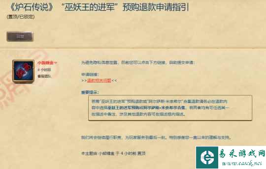 当前,《炉石传说》的退款通道已经开放了三天,不少玩家都已退款成功。不过,还是有部分购买了预售内容的玩家,因为各种各样的原因没能成功申请到退款,并且主要集中于IOS用户身上。