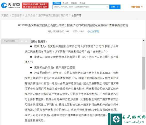 天眼查App显示,近日,浙文影业集团股份有限公司发布关于控股子公司收到法院裁定受理破产清算申请的公告。公告显示,天意影视公司破产清算事项不会对浙文影业的现有业务或持续经营产生重大影响。 天意影视公司进入正式破产程序后,如法院指定破产管理人接管,浙文影业将丧失对其控制权,不再将其纳入公司合并报表范围。 天眼查信息显示,浙江天意影视有限公司成立于2006年8月,法定代表人为吴毅,经营范围包括制作、复制、发行:专题、专栏、综艺、动画片、广播剧、电视剧;网络剧制作、复制、发行;电影摄制、发行等,由浙文影业集团股份有限公司和新余上善若水资产管理有限公司共同持股。 风险信息提示,今年10月,该公司被湖南安妮特种涂布纸有限公司申请破产审查。此前,公司法定代表人吴毅因涉嫌职务侵占犯罪被公安机关刑事立案侦查。据悉,吴毅曾担任《士兵突击》、《我的团长我的团》等剧集制片人。 |