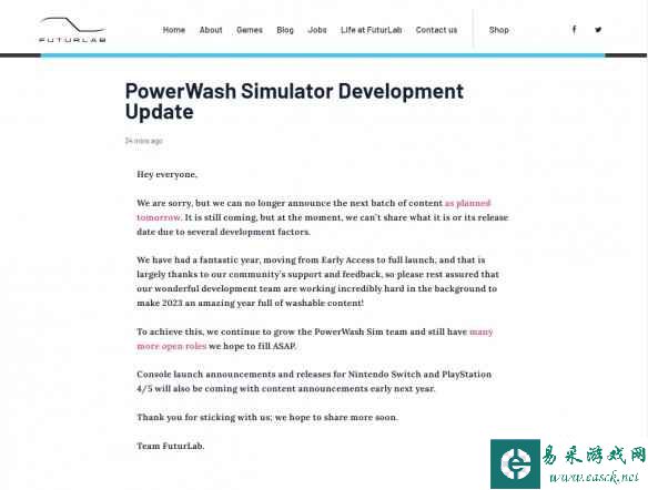 在今年9月的东京电玩展上,史克威尔艾尼克斯宣布Steam好评如潮的《冲就完事模拟器(PowerWash Simulator)》PS4、PS5、Switch版将在“近期发布”。 当时SE没有宣布明确的发售日期,在鸽了三个月之后,现在开发商FuturLab终于发布了一个更新——透露PS/NS版本将在“2023年初”公开更多信息。这也将包括一些新的内容公告和游戏的发布日期。 “Switch和PS4/5的主机版发布公告和发布日也将在明年初公开……我们希望能尽快分享更多消息。” 自发售并登陆Xbox Game Pass以来,本作收获了大量的玩家好评,甚至在Steam上获得了有史以来好评率最高游戏的殊荣。游戏中玩家作为一名专业的高压清洗工,可以将任何灰尘、灰尘和泥土冲走。 |