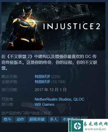 《不义联盟2》1折、《星球大战 绝地:陨落的武士团》1.2折、《战地1》1.2折、《泰坦陨落2》1.6折、《真人快打11》2折、《羞辱2》界外魔之死捆绑包2折、《DOOM》2.5折 等,来看下今天的“Steam每日特惠游戏”推荐吧。 《不义联盟2》 原价138元,现价13.8元 |