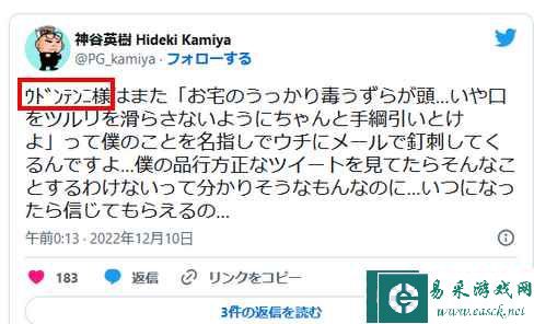 ·10日神谷英树忽然发推表示,又收到了来自堂天任的“毒うずら(神谷的外号)要把好口风!不要一不留神透露口风了!”,几乎指名道姓般的警告,还吐槽如果认真的阅读自己的品行端正的推特的话根本不可能犯那种错,哀叹究竟什么时候才能彻底获得信任呢···