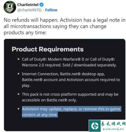 但也有人对退款持悲观态度,因为他在动视的游戏条款中发现了相关条目,遂表明了自己的看法:“不会有退款的,动视的法律注释中明确说了,官方能随时随地更改游戏中的微交易内容。”