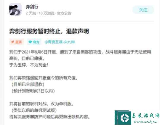 在TapTap上的评分高达9.2的国产独立游戏《弈剑行》,其主创团队一共只有两人。耗费了三年时间才将游戏打磨好、获得版号批准与玩家们见面。结果在上架当天就遭到了黑客攻击,导致了服务器的瘫痪。