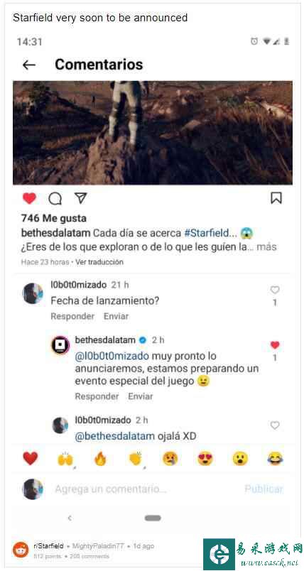 Bethesda的拉丁美洲Instagram账号已经透露:《星空之地》的发售日“很快”就会公布,而且很可能会在即将到来的《星空之地》展示会中公布。 Reddit用户MightyPaladin77与我们分享了这一消息,Instagram帖子的一条评论表达了玩家想要知道更多关于《星空之地》消息的愿望,而B社回复了这条评论,说道:“我们‘很快’就会公布游戏发售日,我们正在为这款游戏准备一个特别的展示会”,最后他们还用了一个有点顽皮的表情符号。