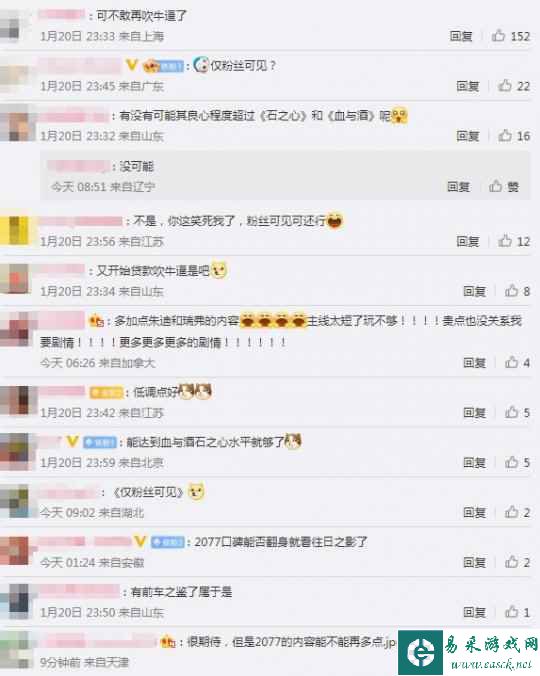 在评论区有人调侃:“可不敢再吹牛逼了!”“有没有可能其良心程度超过《石之心》和《血与酒》呢?”“很期待,但是2077的内容能不能再多点?”“又开始贷款吹牛逼是吧。”