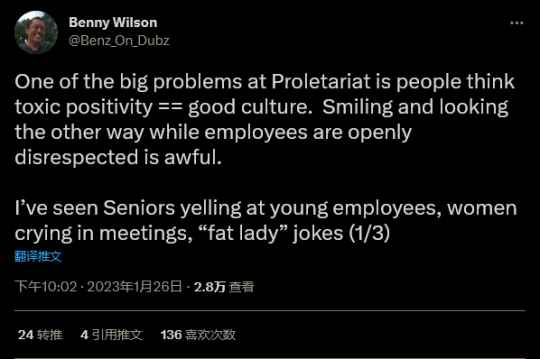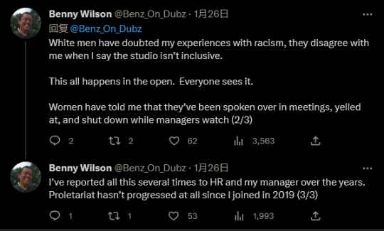 在推特上发布的一系列帖子中,高级图形工程师 Benny Wilson 解释道,员工在公开的场合下都完全不被尊重。 “我见过老员工对年轻员工大吼大叫,女性同事在会议上被骂哭,还有‘胖女人’笑话,”他描述道:“白人质疑我受到种族歧视的经历,当我说工作室不具有包容性时,他们不同意我的看法。”