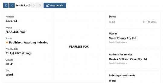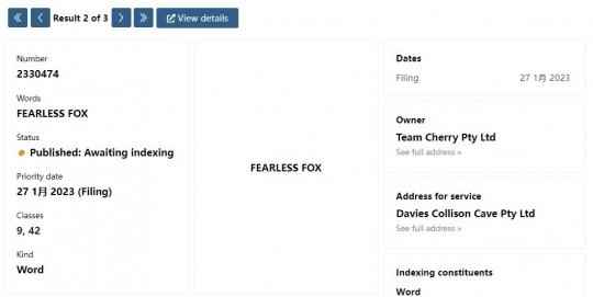 《空洞骑士:丝绸之歌》开发商Team Cherry已在澳大利亚为“Fearless Fox”一词申请了商标,这看上去似乎是一个未宣布的游戏项目。 其实早在2019年,Team Cherry就为“Fearless Fox”申请了第九类商标,这意味着它与计算机游戏软件有关。