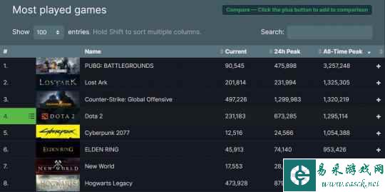 如果去除网游,只看单机游戏的话,《霍格沃茨之遗》能排名第三,仅次于《赛博朋克2077》和《艾尔登法环》。
