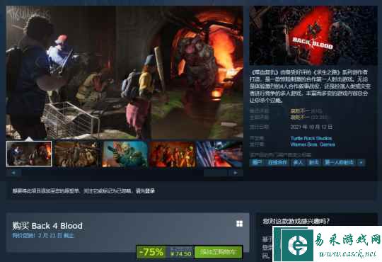 尽管近期并没有什么大促活动,但由Turtle Rock开发的生存射击游戏《喋血复仇》,陡然间还是在Steam上开出了2.5折的超低优惠。相较于游戏首发时289元的售价,如今的74元对玩家来说不要太友好。