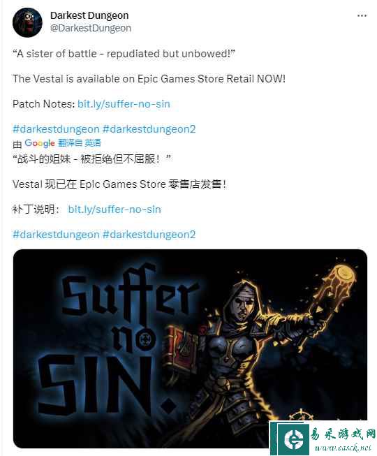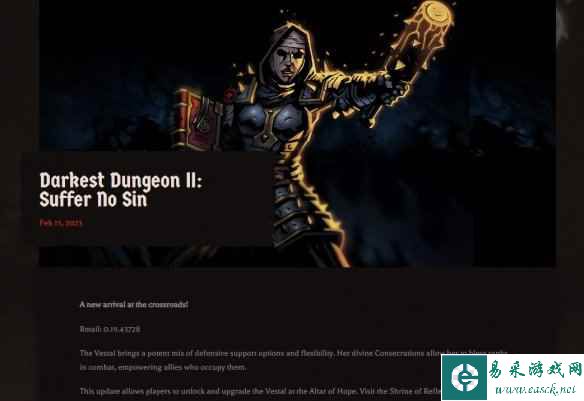 《暗黑地牢2》官方发布了更新公告,除了一系列的平衡性调整、游戏优化外,此次更新加入了前作中的角色“战斗修女”,已在Epic商城可玩。本次更新是名为“无罪(Suffer No Sin)”系列更新的一部分,未来将加入更多角色。