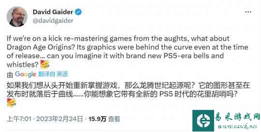 《龙腾世纪:起源》曾被IGN评为最佳现代RPG游戏之一 David Gaider是Bioware《龙腾世纪:起源》的首席编剧和设定主创,后续参与了《龙腾世纪2》和《龙腾世纪:审判》的开发。 在Twitter上,Gaider写道:“如果我们正在重新制作从2000年代开始的游戏,那么《龙腾世纪:起源》呢?即使在当时发行时,它的图形也落后于潮流......你能想象它加入了全新的PS5时代特效和花哨效果吗?”