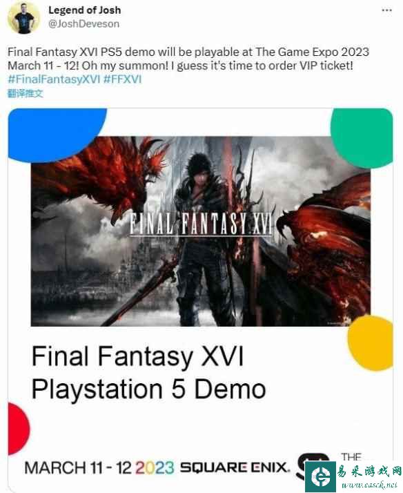 爆料2023游戏博览会将提供《最终幻想16》PS5试玩