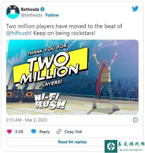 而今天,Bethesda官方推特发布推文,透露在过去一个多月的时间里,《Hi-Fi Rush》的玩家人数已经超过了200万人!