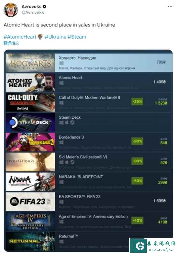 前几日,在推特网友晒出的原子之心乌克兰销量梗图中也出现了永劫无间的身影。