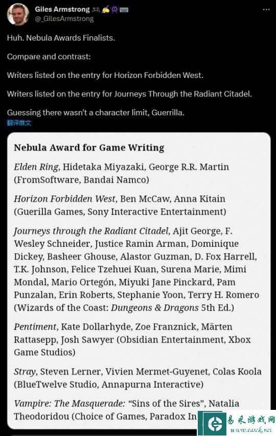 相比之下,同样获得星云游戏编剧奖提名的威世智龙与地下城新官方模组《耀光城之旅》的编剧团队全员名字就被一一列出。 《地平线:西之绝境》开发者 Giles Armstrong 在推特上发文,表达了自己的担忧。