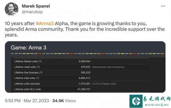 拟真军事射击游戏《武装突袭3》近期迎来了上线10周年,游戏官方CEO透露本作在Steam上已经卖出超过800万份,DLC累计总销量超过了4700万。 “武装突袭”系列以硬核拟真著称,受到不少玩家喜爱;该系列还衍生出过不少mod,DayZ和吃鸡都源自于这个系列。《武装突袭3》最初于2013年开始进行A测,后续不断发展更新,至今已有10年历史。游戏官方CEO Marek Spanel最近公开了一些它的数据信息,并表示:10年过去了这个游戏依旧坚挺! 此外,数据中显示《武装突袭3》主要玩家群体来自西欧、北美、俄罗斯和独联体地区;在过去12个月内,《武装突袭3》每天仍然有数万活跃用户。 目前《武装突袭》系列最新作《武装突袭Reforger》已经推出,不过它仍在抢先体验,内容还不完善,要想超越《武装突袭3》还得一段时间。 |