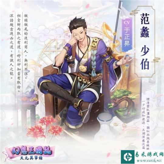 范蠡本是楚人,出身贫寒但聪敏睿智,年轻时便博学多才,以经商致富。在《幻想三国志—天元异事录》中,其行事狂放负俗,善营财货,最讨厌赔本生意。后被文种赏识,仕于越王勾践。助越王勾践成就霸王之业后,知其必不能容己,故辞官去越,与西施乘舟出三江之口,入五湖之中后三迁至陶,在此经营,富甲天下,自号陶朱公。