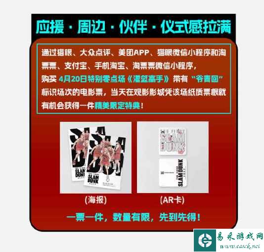 官方宣布开启《灌篮高手》青春盛典·百城联动零点狂欢观影场,购买4月20日零点场带有“爷青回”标识场次的电影票,在观影影城凭纸质票根就有机会获得一件精美限定特典(海报、AR卡)。