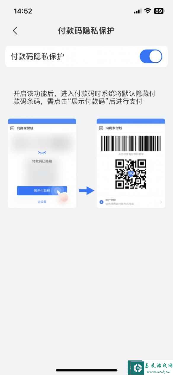 在开启“付款码隐私保护功能”之后,付款码会自动隐藏,在需要支付时,点击“展示付款码”即可正常使用。