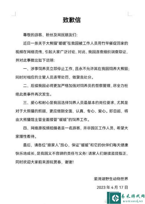 4月17日,紫清湖野生动物世界发布致歉信称:涉事饲养员立即停止工作,且永不允许其在我园饲养大熊猫;同时对相应主管人员做警告处分。