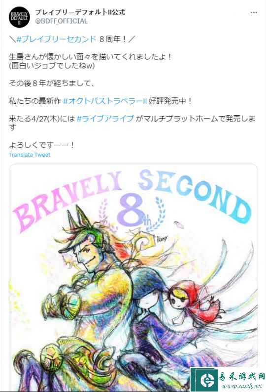 万张原创RPG地图!都在UP对战平台>>>>>> 领取UP对战平台礼包!免费获得美杜莎底纹>>>>>> 今日(4月23日),《勇气默示录2终结次元》官方宣布游戏发售8周年,并发布了由生岛直树绘制的纪念贺图。官方在庆祝同时还表示《歧路旅人2》正在好评发售中,并宣传了即将在4月27日登陆PS5/PS4/Steam平台的《时空勇士》HD-2D重制版。 《勇气默示录2终结次元》是Silicon Studio和史克威尔艾尼克斯为任天堂3DS开发的角色扮演游戏,是任天堂3DS游戏《勇气默示录》的续作,于2015年正式发售。游戏于2021年2月26日在Nintendo Switch平台发售,2021年9月3日在Steam平台发售,支持简繁中文。 |