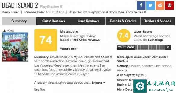 丧尸题材动作冒险游戏《死亡岛2》已于近日发售,而游戏的M站用户评分也解禁了,截止到发稿时为止,一共有79位用户评测了该游戏(PS5版),其中好评为55个,中评6个,差评18个。总的用户评分为7.4分,算是差强人意吧。