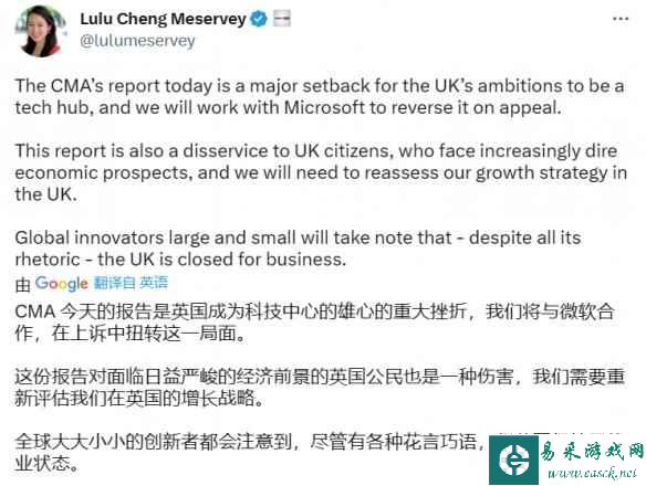 4月26日晚,英国竞争和市场管理局(CMA)正式否决微软收购动视暴雪,动视暴雪企业事务执行副总裁Lulu Cheng Meservey在推特上声明:CMA的否决是英国期望成为科技中心路上的重大挫折,对经济形势日益严峻的英国公民来说也是一种伤害。
