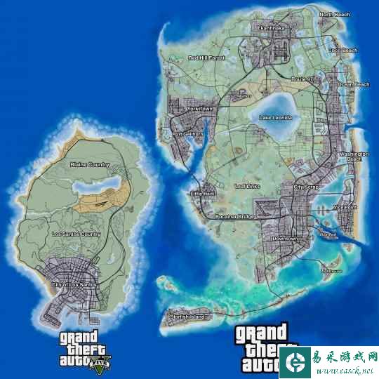 许多人都期待着《GTA6》的到来。近日推特网友GTA 6 Trailer Countdown分享两张图片,声称是《给她爱5》和《GTA6》游戏地图的对比。