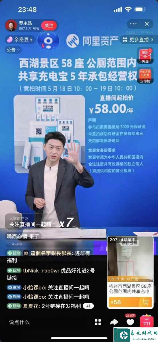 继卖卫星之后,罗永浩淘宝直播间又有新奇产品上架——拍卖了杭州西湖景区58个厕所共享充电宝的经营权。