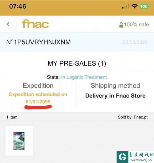 随着《塞尔达传说:王国之泪》发售日的临近,玩家们都对这款游戏充满了期待。有玩家分享了自己遇到的倒霉事儿,零售商在通知《王国之泪》卡带的交货日期时不小心把时间弄错了。 这位玩家在法国零售商Fnac预购了《塞尔达传说:王国之泪》实体版本,结果Fnac在给他发交货日期通知的时候把时间弄错了,图片上显示卡带将在2099年1月1日交到这位玩家手中,距离现在还有70多年。