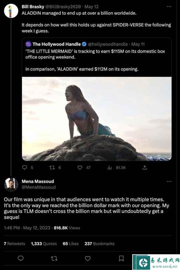 近日,在一条预测真人电影《小美人鱼》北美首周末票房1.15亿美元,并对比《阿拉丁》首周末票房1.12亿美元的推文下,《阿拉丁》男主梅纳·马苏德的回复被指黑人种族歧视。